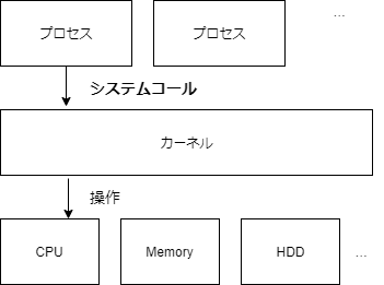 そのためユーザと OS で権限を分け、デバイス操作やプロセス操作を OS が一元管理する。この機能を提供している OS の中核部分をカーネルと呼び、この機能の実行依頼をシステムコールと呼ぶ。